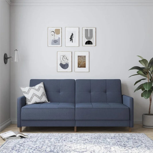 Andora Coil Futon Sofa Bed Couch with Mid Century Modern Design - Navy Blue Linen